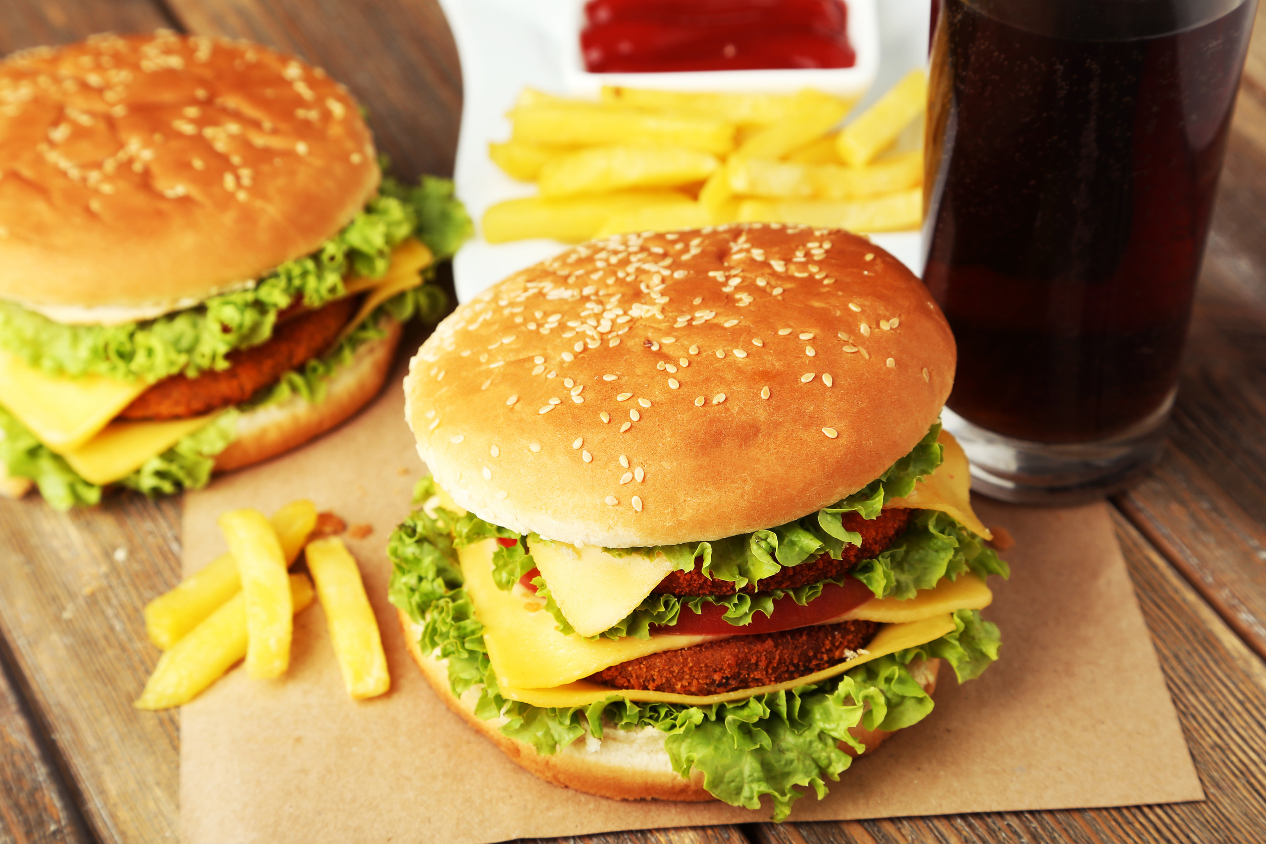 Big burgers on brown wooden background